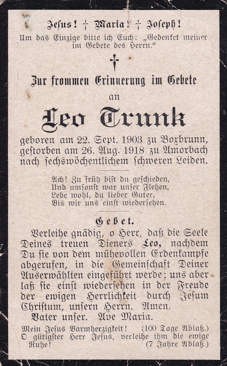 Meine Oma erlebt den Verlust eines Bruders durch einen Unfall als vierzehnjährige hautnah mit. Bei Arbeiten an einer Mühle geriet ihr Bruder (wahrscheinlich Leo Moritz, geb 1903) mit dem Bein in die Mühle woraufhin es amputiert werden musste. Der Junge überlebte die Operation zunächst, starb jedoch später im Krankenhaus an einer Lungenentzündung (Quelle: Erzählung der Anna Achtmann, Gedächtnisprotokoll Ralf Achtmann, s. auch Sterbebild)